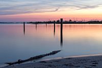 Foto van een mooie haven tijdens zonsondergang met een drukbezochte jachthaven op de achtergrond