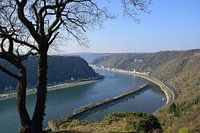 De haven van Loreley gezien vanaf het Kultur und Landschaftspark Loreley bij Sankt Goarshausen in Duitsland. Het is eigenlijk een afgescheiden deel van de Rijn waar kleinere schepen kunnen aanmeren.