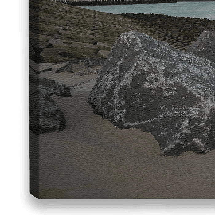 De haveningang van Oostende , de Oostelijke en Westelijke Strekdam schermen de haven af van de grillige Noordzee . In de voorgrond wat basaltblokken en een pluk duinhelm .