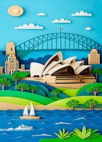 Grillig en ingewikkeld gemaakt papieren knipselkunstwerk met de haven van Sydney. Het iconische Sydney Opera House en de Harbour Bridge steken af tegen glooiende groene heuvels en diepblauw water met zeilboten, allemaal gepresenteerd onder een gelaagde blauwe lucht met uitgesneden wolken en een zon.