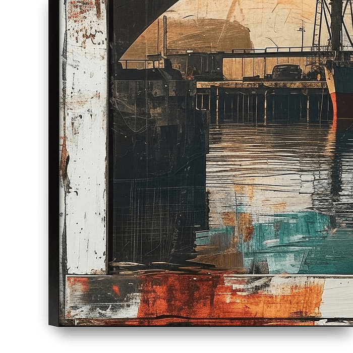 Een havenillustratie in de stijl van een ingelijst vintage schilderij.