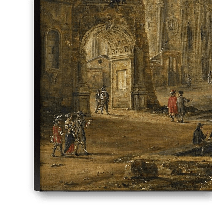 Op dit schilderij vormen de massieve antieke gebouwen het kader rond een scène uit een mediterrane haven. Het kenmerkende mediterrane licht is weergegeven in een bijna gouden kleurenpalet, dat samen met het personeel op de voorgrond en de antieke architectuur het tafereel een levendig en schilderachtig aanzien geeft.