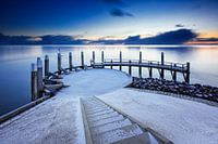 De trap neemt je mee naar beneden en het oog volgt de krul in de steiger en laat je kijken naar de oranje gloed van de zon.