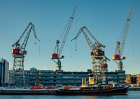 De foto toont een scheepswerf in helder winterlicht: ritmische kranen tekenen lijnen tegen de blauwe lucht, terwijl de kade met containers en het water diepte geven. De sleepboot voegt schaal en karakter toe. Perfect voor liefhebbers van techniek, architectuur en stedelijke havenscènes.
