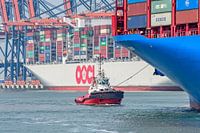 De SD Rebel assisteert bij het vertrek van de Cosco Shipping Gemini.