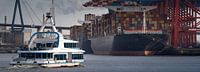 Havenveerboot en containerschip in de haven van Hamburg van Jonas Weinitschke