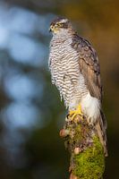 Een vrouwelijke havik zit op een bemoste houten paal in het licht van de herfstzon.