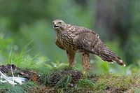 Jonge vrouwtjes Havik staand tussen hoge grassen en met een duif als prooi gefotografeerd midden in een bos in Nederland.