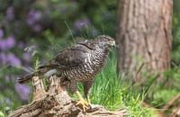 Een Havik is op jacht bij een poel in het bos en kijkt schichtig om zich heen, op de Kalmthoutse Heide in België/Nederland.