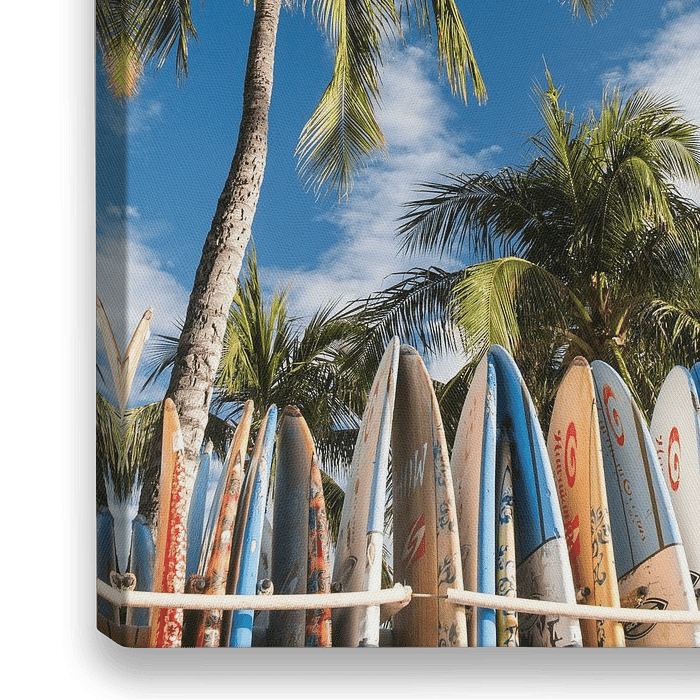 Gefotografeerd op Waikiki Beach op Oahu in de namiddag; een stel surfplanken met op de achtergrond de palmbomen. Precies zoals je van Hawaii verwacht!