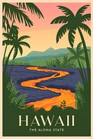Een warme zonsondergang glinstert over zachte golven terwijl een gloeiende lavarivier zich door weelderige palmbomen slingert. Dit levendige kunstwerk vangt de geest van Hawaï, perfect voor de woonkamer of een inspirerende ruimte waar dromen over de tropen en avontuur ontwaken. Een waar aloha-moment!