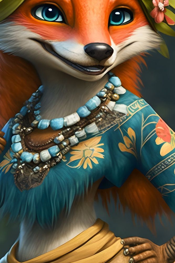 Een vossenmeisje in een stijlvolle Hawaiiaanse outfit in de stijl van schattige kinderanimatiefilms.