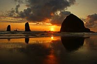Haystack Rock, Cannon Beach, reflectie op het natte zand bij laag water, tijdens zonsondergang. De wolken en andere rotsformaties maken het plaatje compleet.