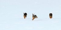 Drie rennende / spelende hazen in besneeuwd winter landschap.