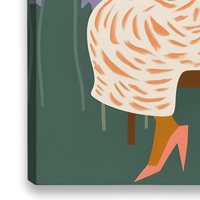 He Loves Me is een kleurrijke illustratie van een vrouw met prachtige hoge hakken in een natuurlijke omgeving. Het contrast met haar rijke kleding, hoge hakken, sieraden en haute couture uitstraling in combinatie met de bloemen in het groene veld, zorgen voor een mooi contrast. Dit maakt het werk een waar pareltje aan de wand!