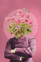 Ik zie een keurig in paars geklede man, bloemen en vlinders.