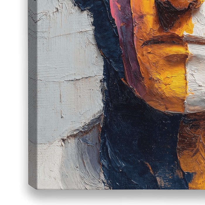 Een abstract portret van een menselijk gezicht, waarbij de nadruk ligt op een gestructureerde impasto schilderstijl waarbij de gelaatstrekken zijn opgebouwd uit dikke lagen verf, wat een driedimensionaal effect geeft. De wisselwerking tussen kleur en textuur leg de emotionele diepte en complexiteit van het onderwerp vast.