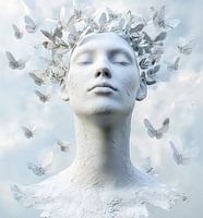 Portret sculptuur van een man met vlinders in grijs en lichtblauw tinten.
