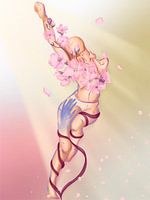 Dit kunstwerk verbeeldt een moment van heling en innerlijke bevrijding. Het figuur stijgt op in een zachte straal van licht, terwijl roze bloesems zich openen op de plekken waar ooit spanning of pijn verborgen lag. Ze symboliseren groei, kwetsbare kracht en de moed om opnieuw te bloeien.