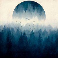 Bos in nevel gehuld met zwerm vogels met grafische elementen fotomanipulatie