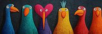 Heart Bird - Dit dieren schilderij toont een groep kleurrijke vogels met grote ogen en een roze hart, die vrolijk tegen een donkere achtergrond staan, waardoor het een speelse en levendige uitstraling heeft, met een nadruk op de diversiteit in hun kleuren en vormen.