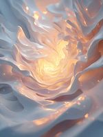 Golvende lagen van zacht blauw, perzik en vloeibaar goud draaien naar een lichtend centrum — alsof warmte zich van binnenuit ontvouwt. Dit is geen zon op afstand. Dit is warmte die leeft, ademt en pulseert.