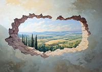 HeartView - Dit landschapsschilderij toont een idyllische, royaal uitgestrekte vallei gezien door een ruw hartvormig gat in een steenachtige muur, met prominent groene cipressen onder een uitgestrekte blauwe hemel.