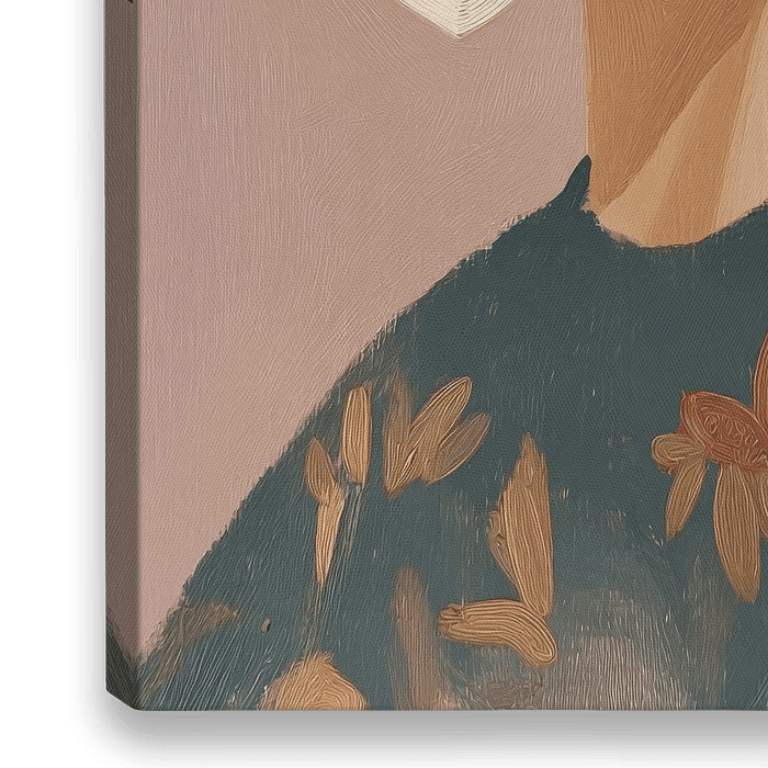 Stijlvol modern portret met hartvormige oorbellen en een elegante bloemenprint – een statement piece dat warmte en karakter toevoegt aan elk interieur.