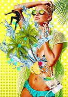 Let op de details zoals de schittering in haar zonnebril, de visjes in het glas en de cocktailprikker in het fruit.