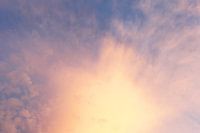 Een aura van dromerige lichtgevende wolken aan de hemel. Mystiek spiritueel droomland bij zonsondergang in pastel / pastelkleur. Een gevoel dat er meer is tussen hemel en aarde. Buitenaards paradijs.