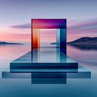 De heldere structuur van het portaal contrasteert met de organische uitgestrektheid van het landschap dat zich op de achtergrond uitstrekt. De lucht baadt in zachte pastelkleuren, terwijl de lichtbrekingen op het glazen oppervlak een fascinerend kleurverloop creëren - van diepblauw tot helder magenta en warm oranje. De weerspiegeling in het water versterkt het surrealistische karakter van de foto en doet het portaal bijna gewichtloos lijken.