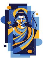 Een vector pop-art portret van Lord Rama met zijn boog en pijlkoker, met opvallende blauwe en gele tinten. Moderne geometrische vormen omlijsten de afbeelding en combineren traditie met hedendaagse stijl.