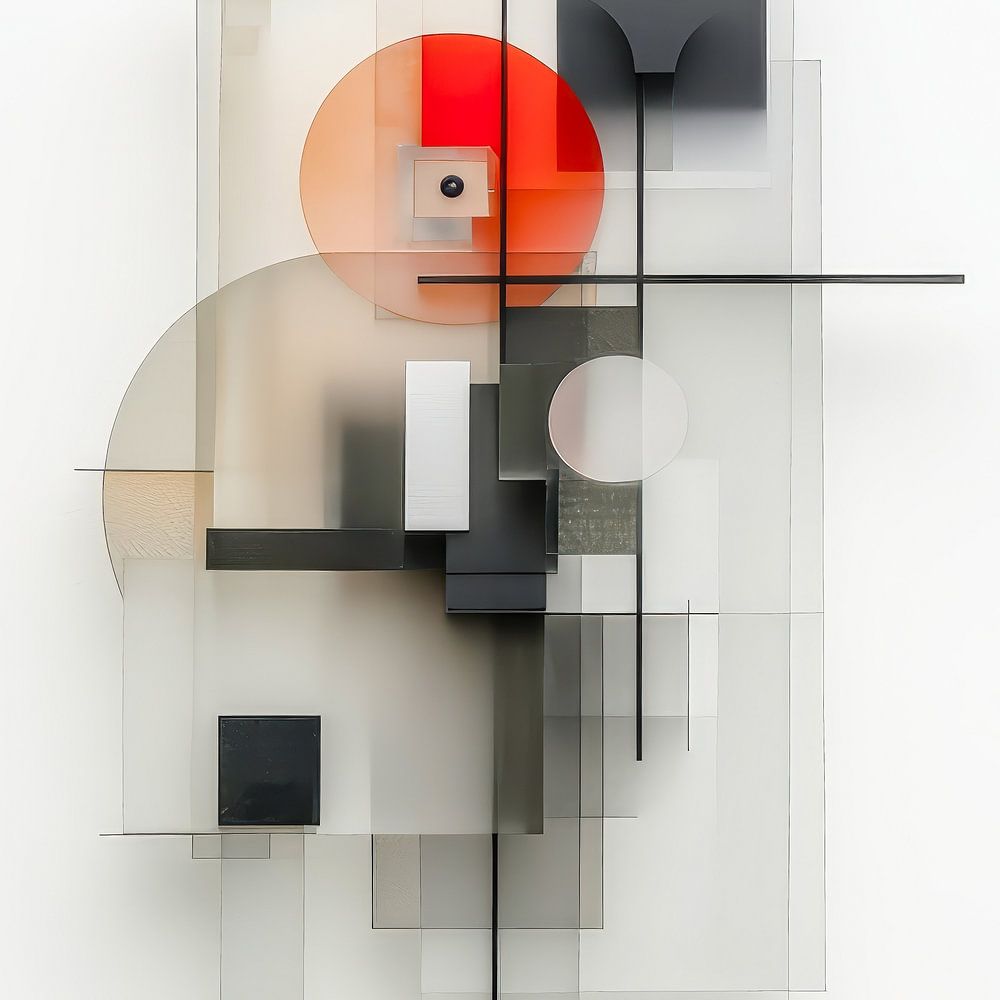 Het contrast tussen de monochrome grijs-, zwart- en beigetinten wordt doorbroken door een intens rode cirkel die als een brandpunt in de compositie schittert. Deze kleurelementen geven het werk een bijna organische dynamiek - alsof het een levend organisme van licht en structuur is.