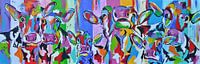 in kleurrijk palet geschilderd. Deze  familie brengt een gezellige sfeer in je huis of kantoor ,Ze kijken nieuwsgierig de ruimte in met hun vrolijke snuitjes. Ze hebben met zijn allen model gestaan  speciaal voor dit schilderij .De prachtige koe die we in het buitenleven in de wei regelmatig zien in ons Hollandse landschap.