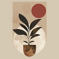 Deze moderne, minimalistische illustratie toont een gestileerde plant voor abstracte geometrische vormen in warme, aardse tinten. Het harmonieuze kleurenpalet en de strakke lijnen maken dit kunstwerk ideaal voor eigentijdse woonruimtes, kantoren of creatieve werkplekken. Perfect voor liefhebbers van moderne kunst die op zoek zijn naar een elegante en rustgevende decoratie.