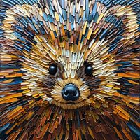 Close-up portret van een egel in mozaïek stijl met voornamelijk blauw en bruin tinten.