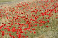 Een landschap in Frankrijk vol met prachtige klaprozen, zover als je kan kijken. Om blij en vrolijk van te worden.