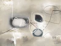 Abstracte minimalistische compositie met zachte neutrale tinten en fijne zwarte en witte lijnen.