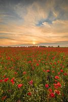 Een mooie zonsopgang bij dit uitgestrekt klaprozenveld met bloeiende klaprozen.