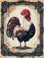 Een statige haan in vintage stijl, met krachtige lijnen en rijke zwartrode accenten. De barokke omlijsting en verweerde achtergrond geven het werk een boeren-romantische grandeur. Ideaal als statement piece in een landelijke keuken of eetkamer.