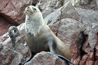 Imposant en sereen heerst deze zeehond over de rotsen van de Ballestas Eilanden, met zijn blik gericht op de oneindige horizon.