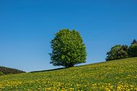 Warme, sfeervolle foto van een boom in een mooi groen weiland vol met gele bloemen. Heerlijk zomers plaatje!