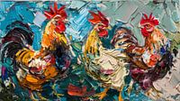 De kunstenaar heeft de impasto-techniek meesterlijk toegepast, met dikke, textuurrijke lagen verf die de energie en het karakter van de hanen naar voren brengen. De kleuren zijn dynamisch en gevarieerd, met diepe roden, heldere gelen, krachtige zwarten en subtiele witte en beige accenten, waardoor elk dier een unieke uitstraling krijgt. De achtergrond, een mengsel van koel blauw en groen, vormt een rustige tegenhanger van de levendige voorgrond, waardoor de figuren nog meer opvallen.
