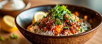 Een verleidelijke fusie van pittige smaken en verse kruiden, liefdevol gerangschikt in een stijlvolle kom. De heldere kleuren van citroen en koriander springen meteen in het oog en roepen een feelgood sfeer op. Ideaal voor de keuken, waar culinaire hoogstandjes en gezelligheid elkaar ontmoeten - een perfect kunstwerk voor de kamer der lusten!