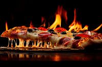 Koop de foto Heerlijke pizza in een vlammenzee - een smaakexplosie van Poster Art Shop op canvas, aluminium dibond, (ingelijste) fotoprint, behang en ArtFrame, op maat geprint in Fine-Art kwaliteit.