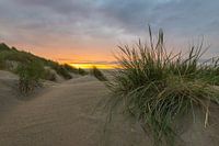 Achter het helmgras in de duinen zakt de zon langzaam in zee