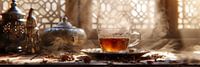 In het betoverende Marokko, waar de zon zich vlecht met de kleuren van de horizon, nodigt deze prachtige muurdecoratie je uit om te verdwalen in de aroma's van heerlijke thee. Op een rustieke tafel, gedrapeerd met exotische stoffen, staat een sierlijke theepot als een kunstwerk. De geur van verse muntblaadjes danst in de lucht, vermengd met de warme tonen van oriëntaalse kruiden. De tafel is omgeven door de rijke patronen van Marokkaanse tegels en de glooiende heuvels van de Sahara schilderen een schilderachtig panorama. Ontsnap naar een wereld waar elke slok een reis is, en elke hoek van dit beeld vertelt een verhaal van gastvrijheid en verrukking.