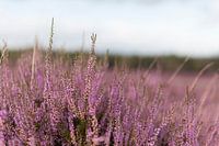 Een detailopname van een bloeiend heideveld in Gelderland.