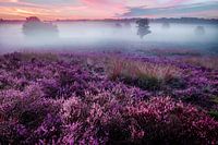 Heide in de vroege ochtend in de omgeving van Vierhouten in Gelderland. Mooie combinatie van zon, mist en paarse kleuren!