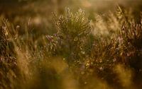 Close-up / macro opname van de heide in het vroege ochtendlicht. Het warme licht maakt het een mysterieus beeld.